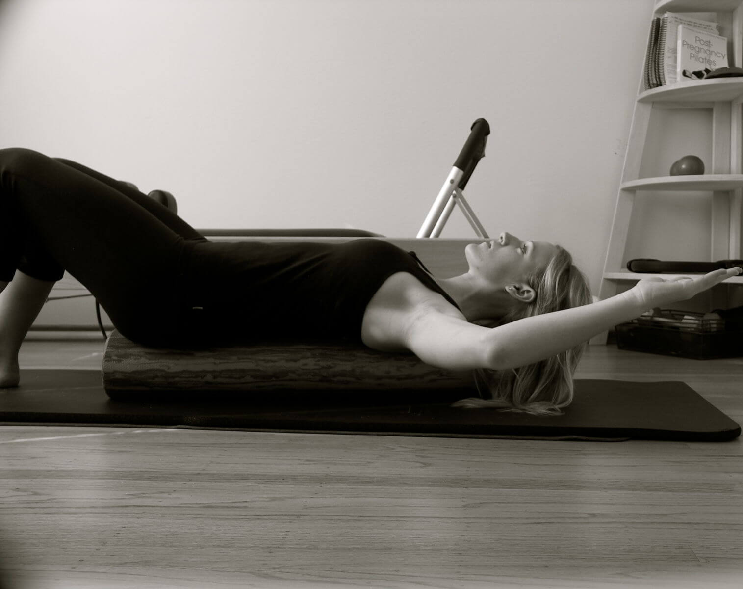 Lie down on the foam roller with your feet flat on the floor and your arms resting by your side. Take a few seconds to breathe and relax into the position.