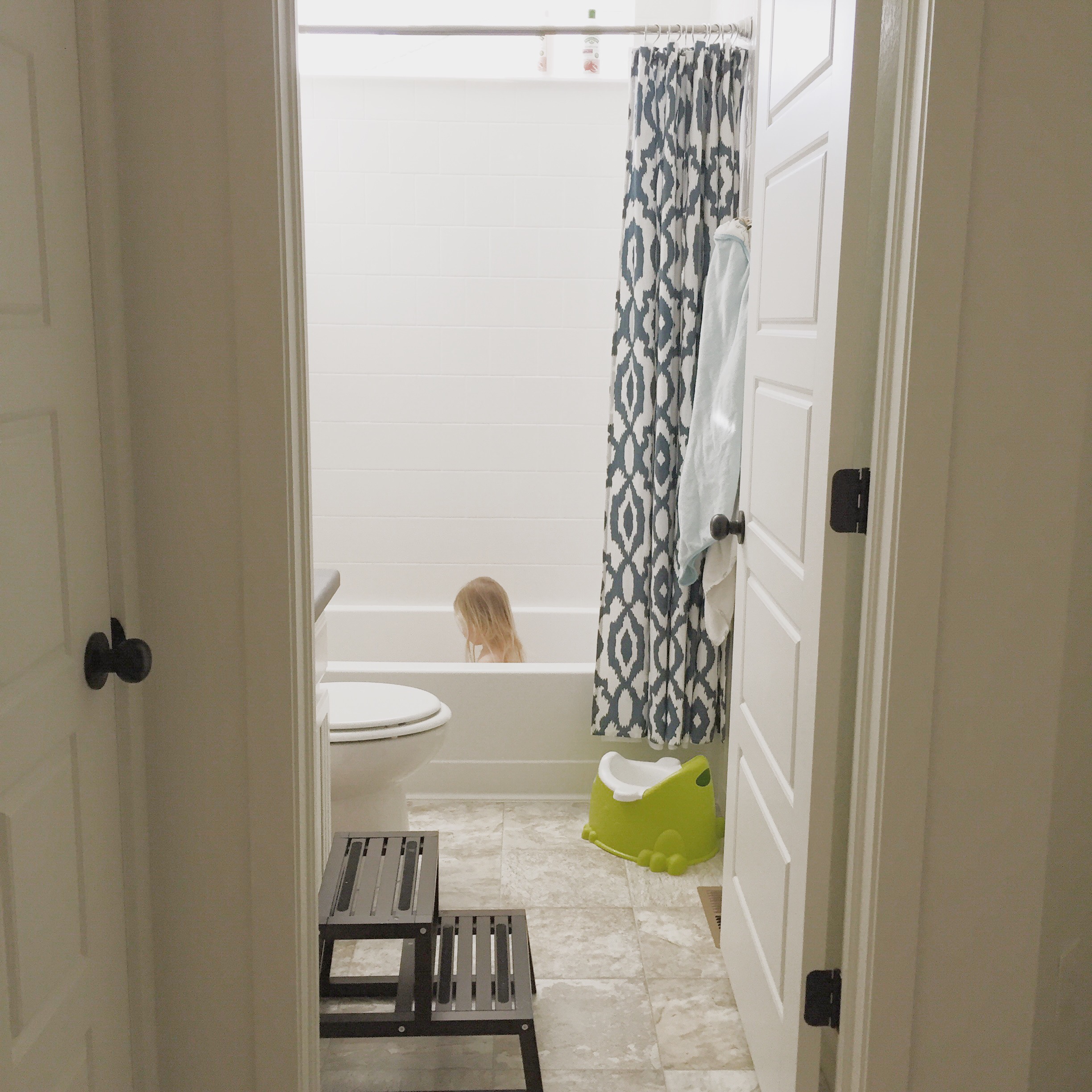 - Make use of bath time: I love bath time! While the baby takes his morning nap, the 3-year-old will play in the bath while I do an online workout on the bathroom floor. Bonus: the bathroom counter makes a perfect barre for barre workouts!