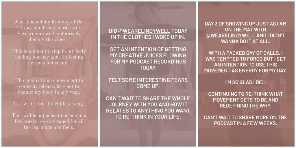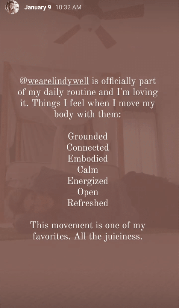 As a natural content creator and 12-year marketer, I decided to share my experience on Instagram Stories for the first 14 days with Lindywell. I posted each day, right after the workout, so rather than telling you how I felt in week 1, I’ll let those posts do the talking.
