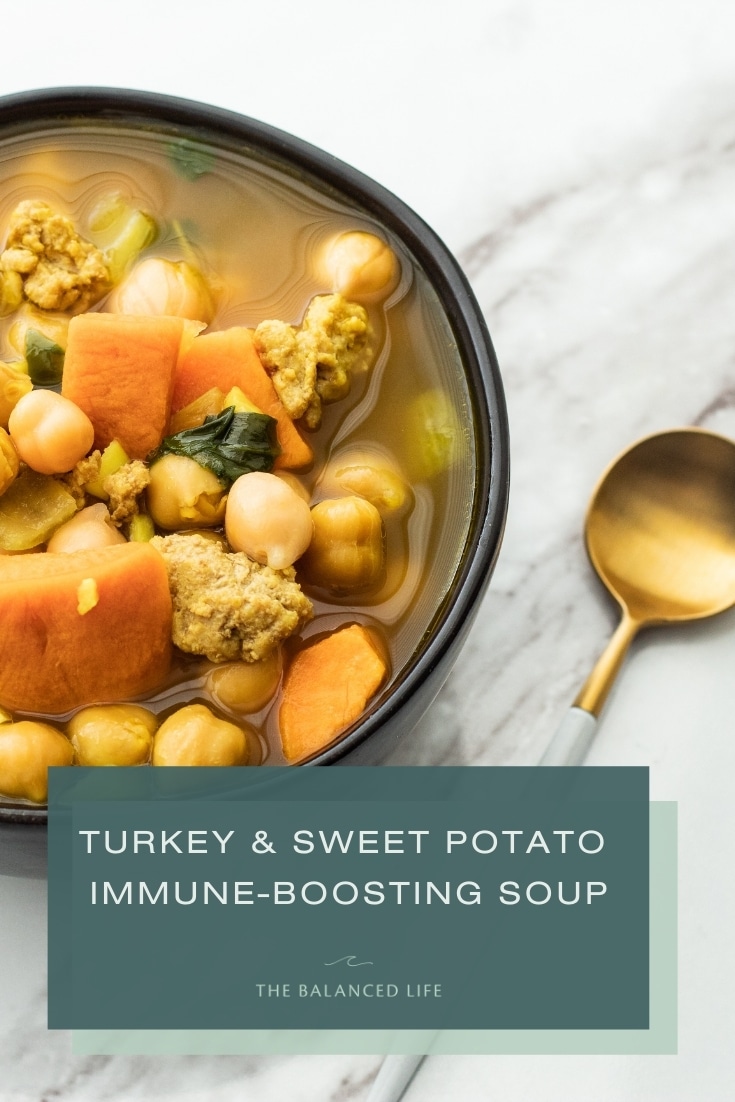 Full of nourishing ingredients like garlic, bone broth, spinach, and turmeric – this delicious turkey & sweet potato immune-boosting soup is the perfect cozy meal for when you aren’t feeling your best or just want something to warm you up on a chilly day.