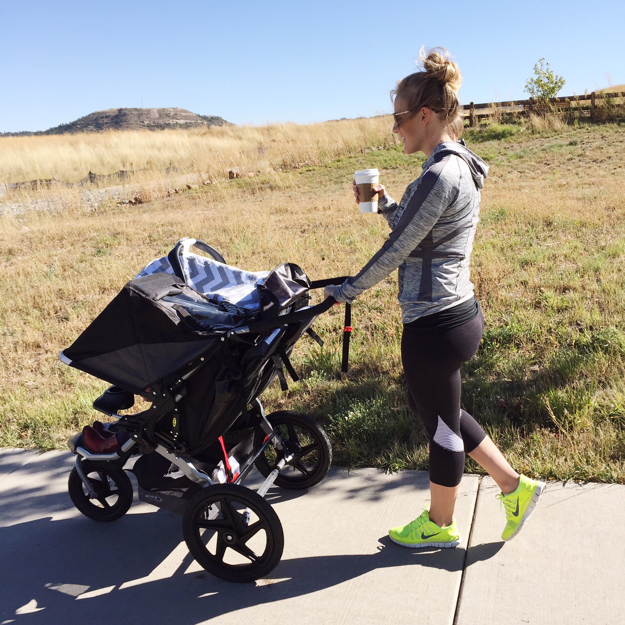 If you follow me on Instagram or Facebook you know I’ve been walking since just a few days postpartum. The walks were very short to begin with and have gradually gotten longer over time. On a good day I’ll walk for about 45 minutes pushing our double BOB. Pushing that thing up hill is a great workout for the legs & booty.